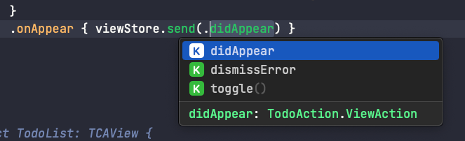 After I wrote the original article Ian mentioned he packs it even more and after playing with it for a few days I now prefer to pack view-related actions under a ViewAction sub-enum, allowing me to scope View layer to only interact with those, it also gives us better code-completion: