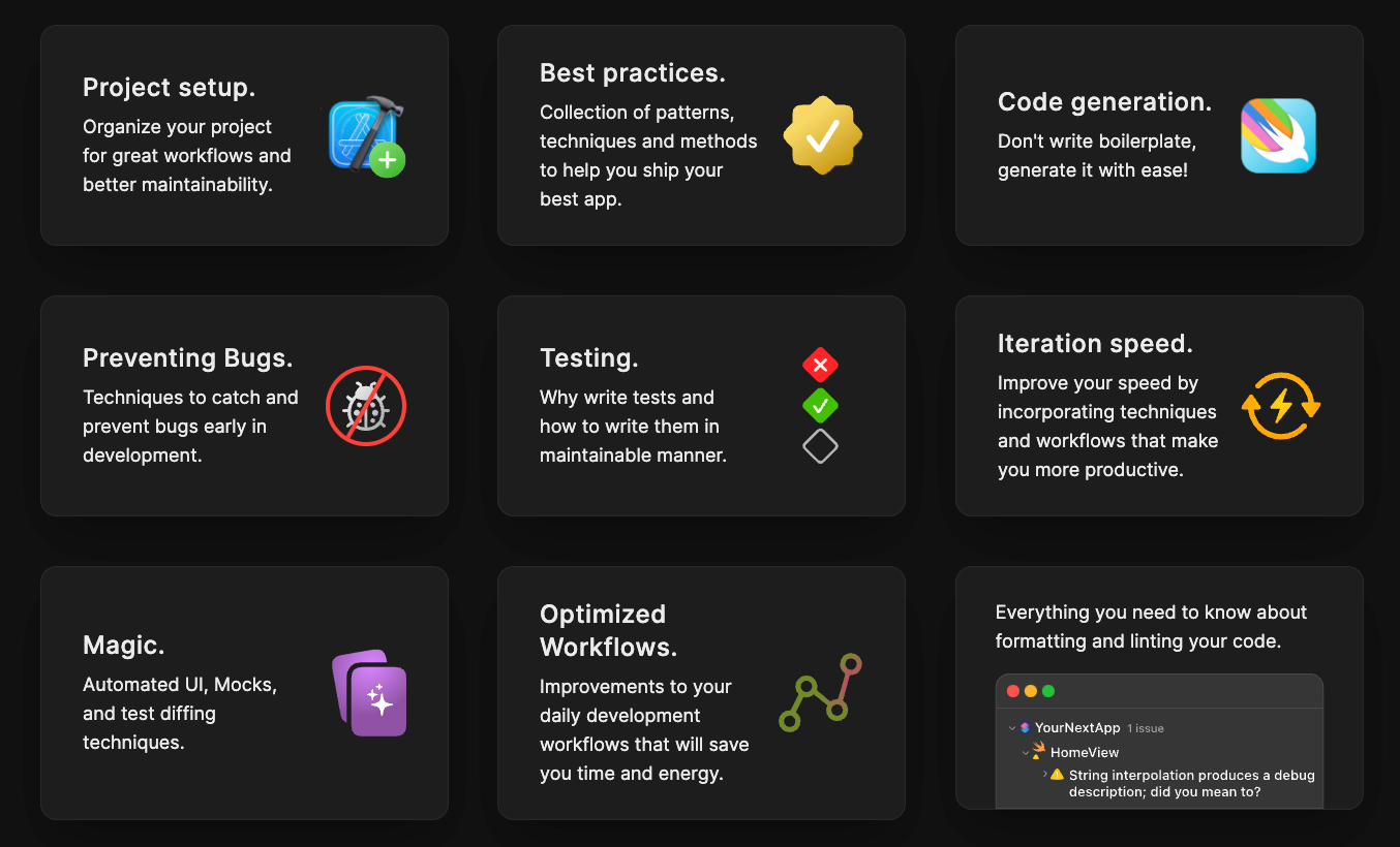 Update 2025: Since launching Swifty Stack, I’ve continued to expand the course based on what I’m using in production and what the community has been asking for. The course has grown from its initial release to 81 lessons across 17 chapters with 7.5 hours of content. Major additions include a full 40-minute AI chapter on configuring AI tools for your projects, 55 minutes on Components Architecture for building server-driven UI, and deep dives into TCA optimization, dev tools, and career advancement. Check out the full curriculum to see everything that’s inside.